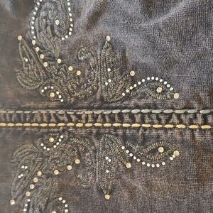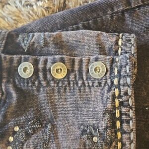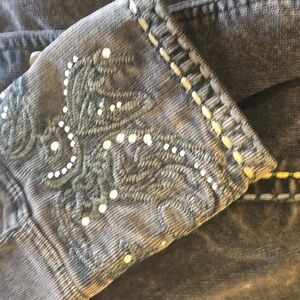 Lightly distressed long brown corduroy jacket. Tastefully Embellished with embroidery and rhinestones on cuffs and back. Cool contrast stitching. Size XL. Measurements laid flat: