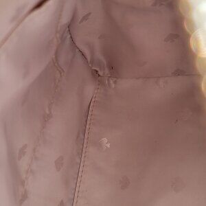 This bag shows visible signs of wear, reflected in pricing. Tarnishing on metal corners. Light scuff on the side of the bag. Light spot visible on the fabric near the top of the zipper. Warping visible on the back panel. Interior has two minor pen marks and one small light red spot. Zippers function properly. Please review all photos carefully, as they are part of the description.