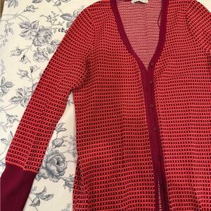 Stylish Zara cardigan and tank set. Features a vibrant red and burgundy pattern. Perfect for layering.