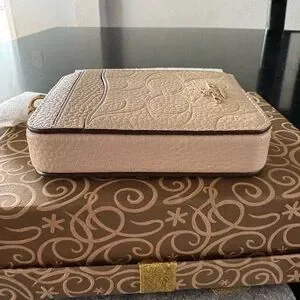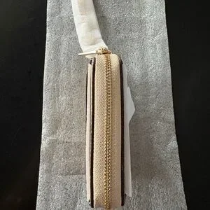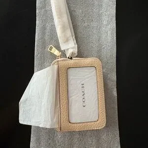 New Coach Zip Card Case in signature pebble leather, typically in a neutral tone like sand, beige, or oat. This compact accessory functions as a card holder and small wallet, often featuring a key ring or dogleash clip for attachment to a bag or keys.