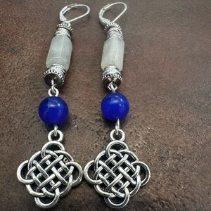 Elegant silver and blue 3in earrings featuring a Celtic knot design. Perfect for adding a touch of sophistication to any outfit.