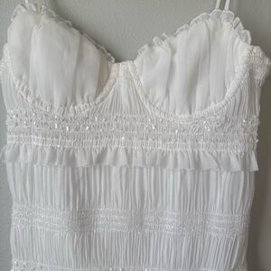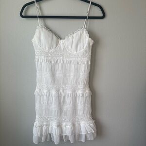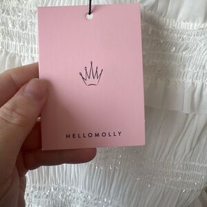 New with tags white mini dress from Hello Molly, perfect for bachelorette parties, bridal showers, engagement photos, or rehearsal dinner looks. Features a flattering smocked bodice with stretch, structured bust, adjustable spaghetti straps, and a tiered ruffle hem. Lightweight and fully lined with subtle shimmer detail throughout. Size S (AU 8 / US 4). Never worn.