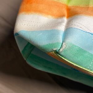 Vibrant Coach shoulder bag with multicolor stripes. Features blue, pink, orange, and green hues. Stylish and elegant design.