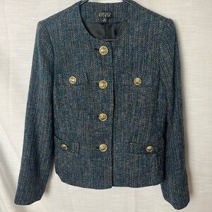 Sophisticated navy tweed blazer by Kasper. Features striking gold button details. Perfect for professional and formal settings.