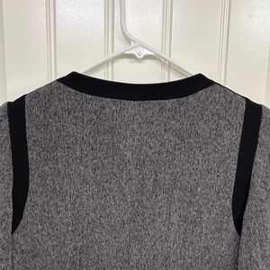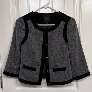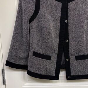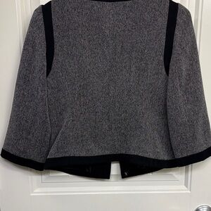 Sophisticated blazer with a modern design. Features black trim and gray fabric. Perfect for professional settings.