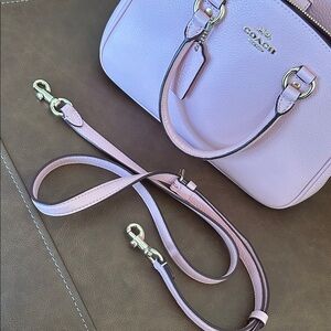 Chic Coach satchel in light pink. Features elegant handles and a structured design. Perfect for everyday style.