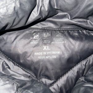 Dark gray quilted jacket by The North Face. Features embroidered logo and front zipper.