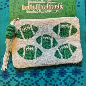 Handmade beaded pouch with green football design. Perfect for travel essentials.