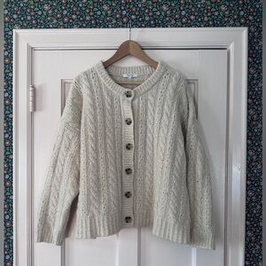 Knit from luxe Italian yarn, this chunky cardigan sweater has buttons down the front and pretty pointelle details (aka those airy little eyelets). So cozy over a dress.