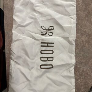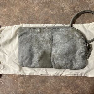 Elegant HOBO clutch with tan interior. Features multiple zippered compartments.