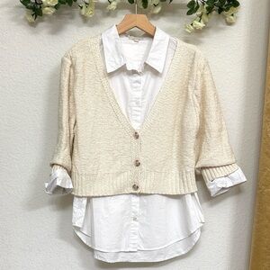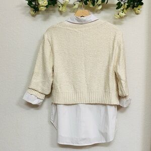 Elan • Cream Knit Cardigan with Attached White Button Up Shirt