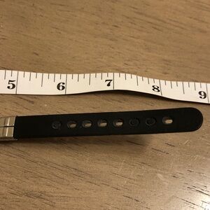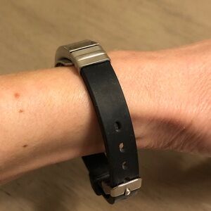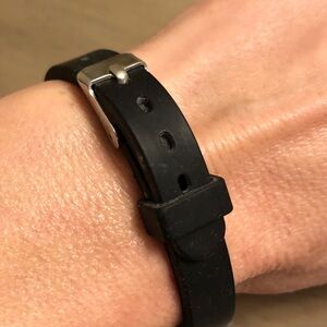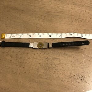 Stylish bracelet featuring a silver tone and black cross design on a black belt band. Perfect for any occasion.