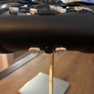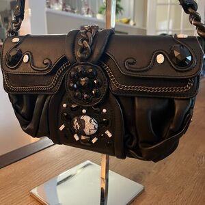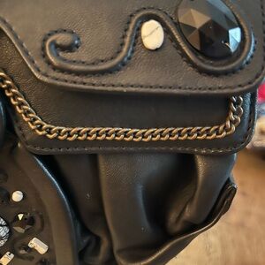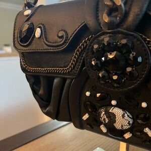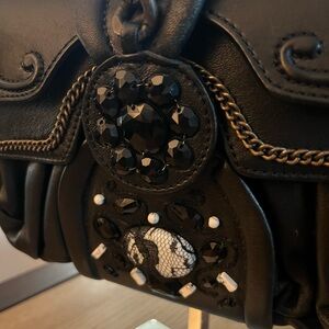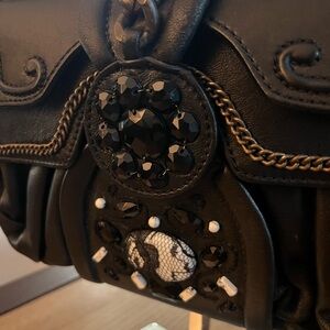 Black leather exterior embroidered with beads, crystals with an antique brass tone hardware