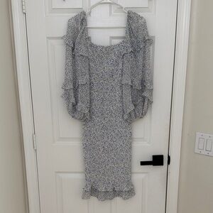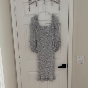 Chic long sleeve dress with floral pattern. Features puff sleeves and fitted silhouette.