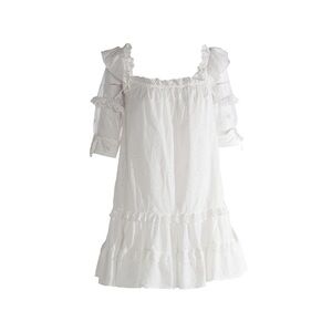 for love and lemons, coquette, cottagecore, romantic, bridal shower dress, bachelorette outfit, honeymoon dress, summer mini dress, eyelet dress, lace dress, puff sleeve, off shoulder, festival style, girly aesthetic, soft girl, date night dress, vacation outfit, white dress, boho chic, feminine style