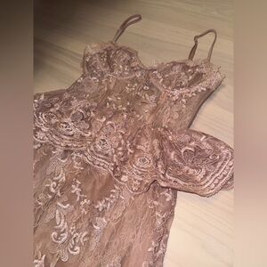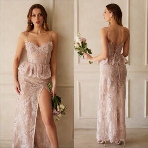 Elegant lace gown in a soft violet hue. Features a delicate lace overlay and a stylish slit. Holes in mesh needs to be fixed!! Ask for photos if needed Black tie