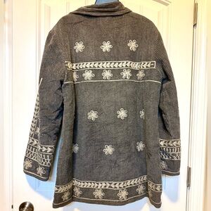 Stylish gray corduroy jacket with intricate white embroidery. Features front side pockets and button closure. Quilted interior. New without tags.