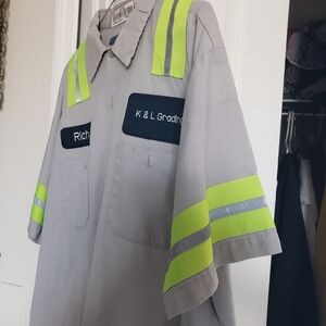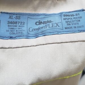 3 sets of used but very good condition high visibility work uniforms by Cintas. these are each the same size; three XL men's grey short sleeve shirts with reflective stripes and patches for "Rich" and "K&L Grading" plus 3 pair size 38 Short leg pants. no rips or tears in the clothing, each shirt has original buttons with some staining but no rips. note the detailed pics