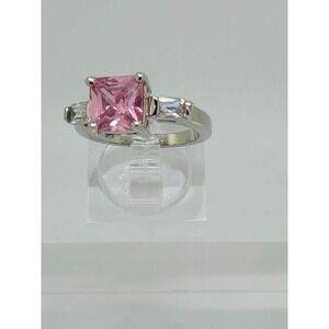 Vintage Pink Princess Cut Three Stone Ring Silver Tone Baguette Accents Size 7