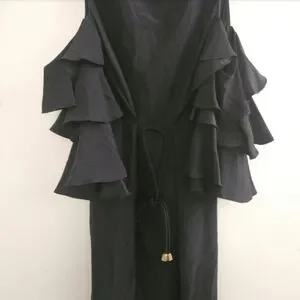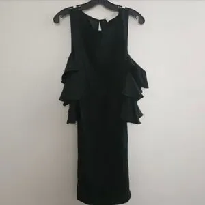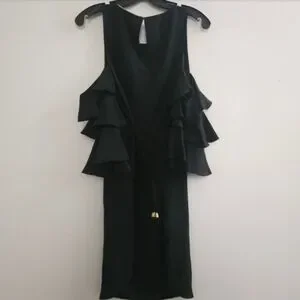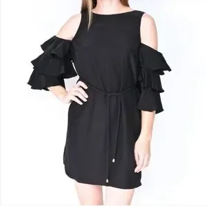 REVOLVE AMANDA UPRICHARD BLACK SILK COLD SHOULDER RUFFLE SLEEVE BELTED DRESS