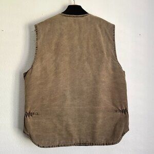 Well-worn vintage Carhartt lined workwear vest with authentic wear and a perfectly broken-in feel. Originally brown and now worn to a light brown / faded tan tone from years of honest use — the kind of natural vintage fade Carhartt buyers actively seek out.