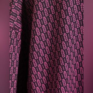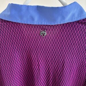 Elegant Greyson polo with a purple base and blue collar. Features a subtle pattern and logo detail. Ideal for versatile wear. Contrasting pink interior.