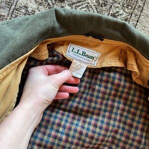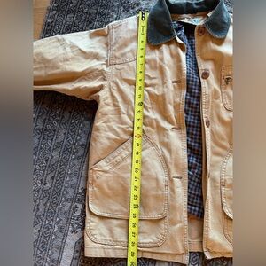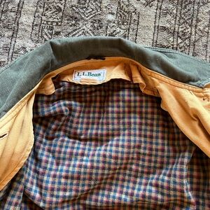 Beautiful Mustard yellow tone, hearty forest green corduroy collar and cuffs, gorgeous buttons, and a removable quilted flannel lining - the flannel pattern colors are gorgeous and complement the outer shell perfectly.