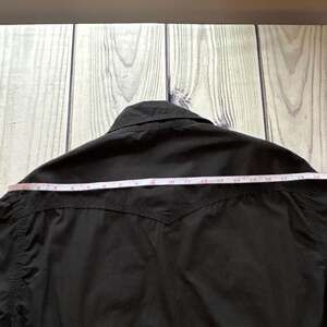 True Religion Black Western Pearl Snap Shirt, Size XL. This classic long-sleeve shirt features pearl snap closures and iconic Western-style chest pockets with horseshoe stitching.
