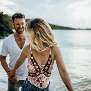 Chic floral bodysuit with pink and cream tones. Features intricate patterns and lace-up detail. Perfect for beach days. Spell & The Gypsy Collective Gypset Lace Up Floral Print Swim One Piece. Hardly worn.