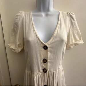Chic cream midi dress with button-front design. Features short sleeves and convenient pockets. Perfect for versatile styling. Two front pockets. Fully button down.