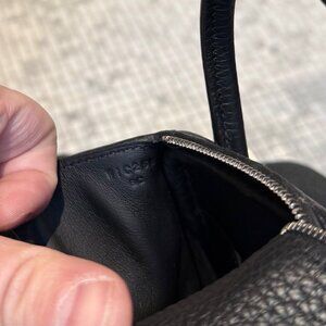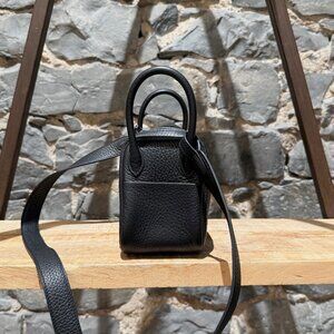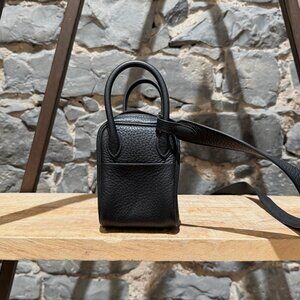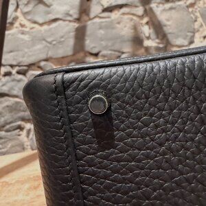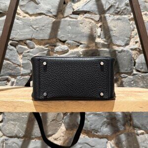 Mini top handle bag with shoulder and crossbody carry options. Black soft taurillon leather with fine pebbled grain. Soft yet structured silhouette. Two (2) rolled leather top handles. Flat leather shoulder strap. Double zip closure with leather tab and metal H stoppers. Two (2) side pockets. Signature Hermès Clou de Selle twist-lock front closure. Branded palladium-plated hardware. Single main compartment with two (2) inner side pockets. Smooth black leather lining. Four (4) metal base feet. W stamp - 2024. Made in France. Comes with Hermès box, dustbag, purchase receipt, ribbon, care booklet, and felt protector.