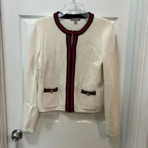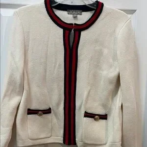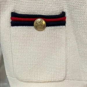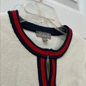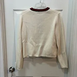 Stylish knit sweater in cream with navy and red trim.
