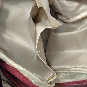 Very nice vegan leather with faux front zipper open inside pocket 2 larger zip compartments,1 inside zipper pocket, 2 slide pockets & 1 back zipper compartment
