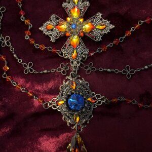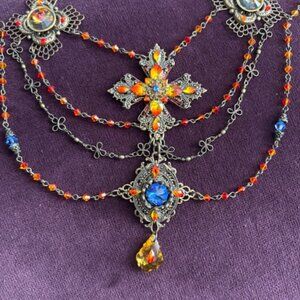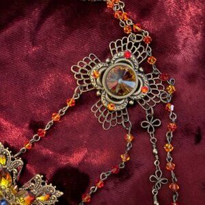 I created this piece especially for the upcoming Edwardian Ball this weekend. This piece has been designed using only Swarovski Crystals with vintage brass chain tying this gorgeous piece together. The Rivoli Swarovski crystals on each side are top-tier for brilliance, clarity, and durability, Known for being elegant, sophisticated, and are associated with a vintage or gothic look.