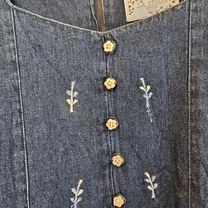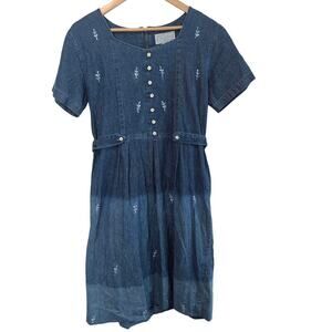 Vintage Denim Dress Women Medium 90s Midi Blue Floral Cottage Granny Prairie