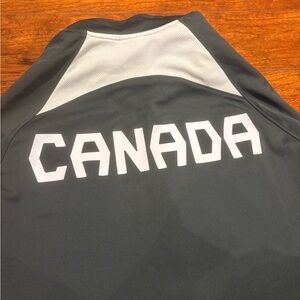 Sleek black windbreaker with Canada emblem. Ideal for sports and casual wear. Features Nike's signature style.