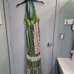 Stylish maxi dress with a halter neckline. Features a mix of green and cream patterns. Ideal for casual outings. Halter style. Worn twice. Unfortunately, too small for me now 😞