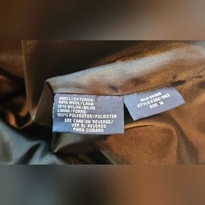 Invest in timeless elegance with this iconic Liz Claiborne double-breasted pea coat, crafted from luxurious wool in a sleek black hue. The classic Crazy Horse design exudes sophistication, while the premium fabric ensures warmth and durability. The double-breasted front and tailored silhouette create a flattering, polished look, perfect for dressing up or adding a touch of refinement to everyday attire. This exceptional coat is a wardrobe staple for discerning fashion enthusiasts, offering enduring style and quality that will last for years to come. Condition: excellent, ready to make a statement in your wardrobe.