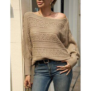 Women’s Apricot Off Shoulder Batwing Crochet Sweater Top, Fall Trendy