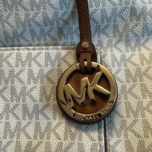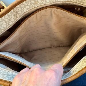 EUC Michael Kors tote with signature tan MK small size monogram on cream/vanilla background. Gold tone hardware. Tons of interior pockets and space for cards, all zippers in good working order. Straps and stitching in great shape (zoom in or ask for more photos if you have questions.) The only visible signs of wear on exterior are noted on the metal pieces on the bottom of the bag. The neutral colored interior could use a cleaning in general (don’t we all hate doing that?) but does not have any pen marks, or anything like that - just what you’d expected from normal use.
