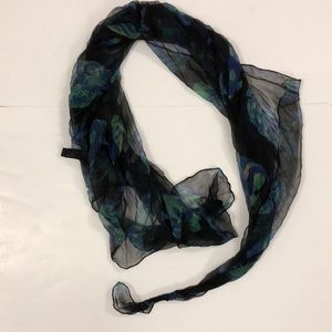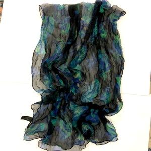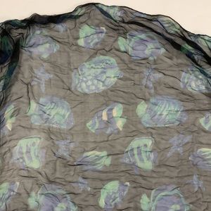 Redfish Designs Scarf 100% silk Sheer Black with Blue Green and little yellow Fish Print approximately 32 inches X 61 inches in Excellent condition but for one unnoticeable pull (see pics) perfect for wrap a formal dress to cover arms and back or worn around neck or even a head scarf
