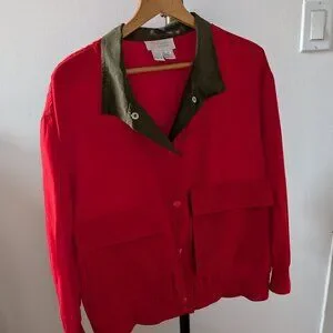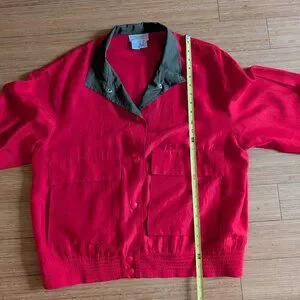 Amazing red 100% silk jacket with olive accents by Schrader Separates. I think vintage from the tag. Super soft to the touch and drapes beautifully - you can tell it's real silk! Great vintage condition, no flaws.