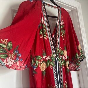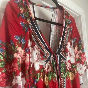 A stunning and vibrant Farm Rio dress featuring a bold red base with lush tropical florals and signature pineapple motifs. Designed with a flattering V-neckline, decorative trim, and a full button-front silhouette, this dress delivers effortless boho-luxe style with a touch of retro charm.