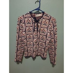 This sweater is pre-owned but in good condition for its age. There is one small hole in right armpit, and the top button is missing. There is also a slight tear in both arms that will show in the last two photos. There is no sizing information on the tag, but it appears to be small/medium. Please go by measurements listed below. 100% virgin wool, dry clean only.