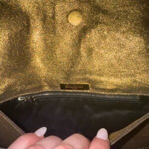 BALMAIN evening clutch in gold croc, suede, and rhinestone patchwork by Christophe Decarnin. Magnetic closure. The inside is gold with a zipper pocket.