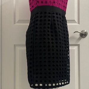 Dex black & fuchsia mini dress with eyelet lace textured design. Sleeveless and stylish. Perfect for a night out. Layer with a blazer for a professional look.
