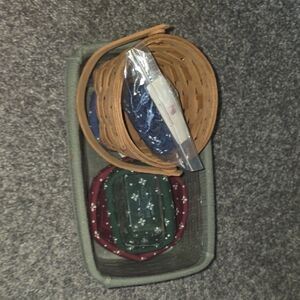 Set of Longaberger baskets with colorful liners. Includes green, blue, and red patterns. Perfect for organizing.