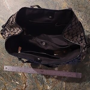 Sophisticated Coach shoulder bag with iconic pattern. Perfect for versatile styling.