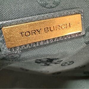 • Interior: Tory Burch monogram fabric lining with one zip pocket and small metal logo plaque