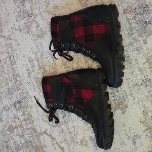 Step out in style with these chic buffalo plaid black and red women's boots. Perfect for adding a bold touch to any outfit.